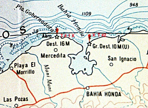 Bahia Honda is approximately 35 miles west of Havana and is the first bay that cruising boats traveling west from Havana are allowed to enter. The charts and cruising guides refer to many shallow areas along this north west coast as coral reefs and it appeared that coral was to be found just outside of the entrance to this bay. Bahia Honda is a rather large industrial bay where freighters and other large vessels are torn apart and recycled. This is also a port for loading dangerous cargoes, especially acids. The first snorkel of the expedition was conducted in an area called Ensenada de Las Salinas from a point at Punta del Morillo south to the guardia frontera post where we anchored (see chart). We did not record any video or take any still images on this first reconnaissance snorkel. There was no question that the water inside of the bay was much greener than the water immediately outside of the bay and that algal coverage increased upon entering the bay. On the outside of the bay, fairly healthy sea grass beds covered the Ensenada de las Salinas, yet there were no fish, conchs, or sea urchins. From this 200 meter snorkel we decided to record the first two video transects in front of the bay, one on the west side (T1) and the other on the east side (T2).