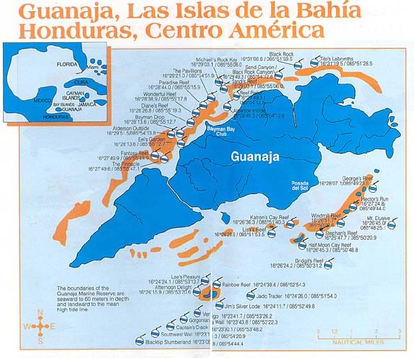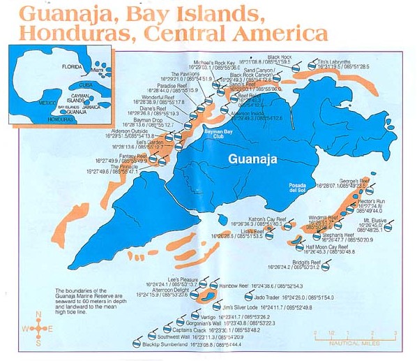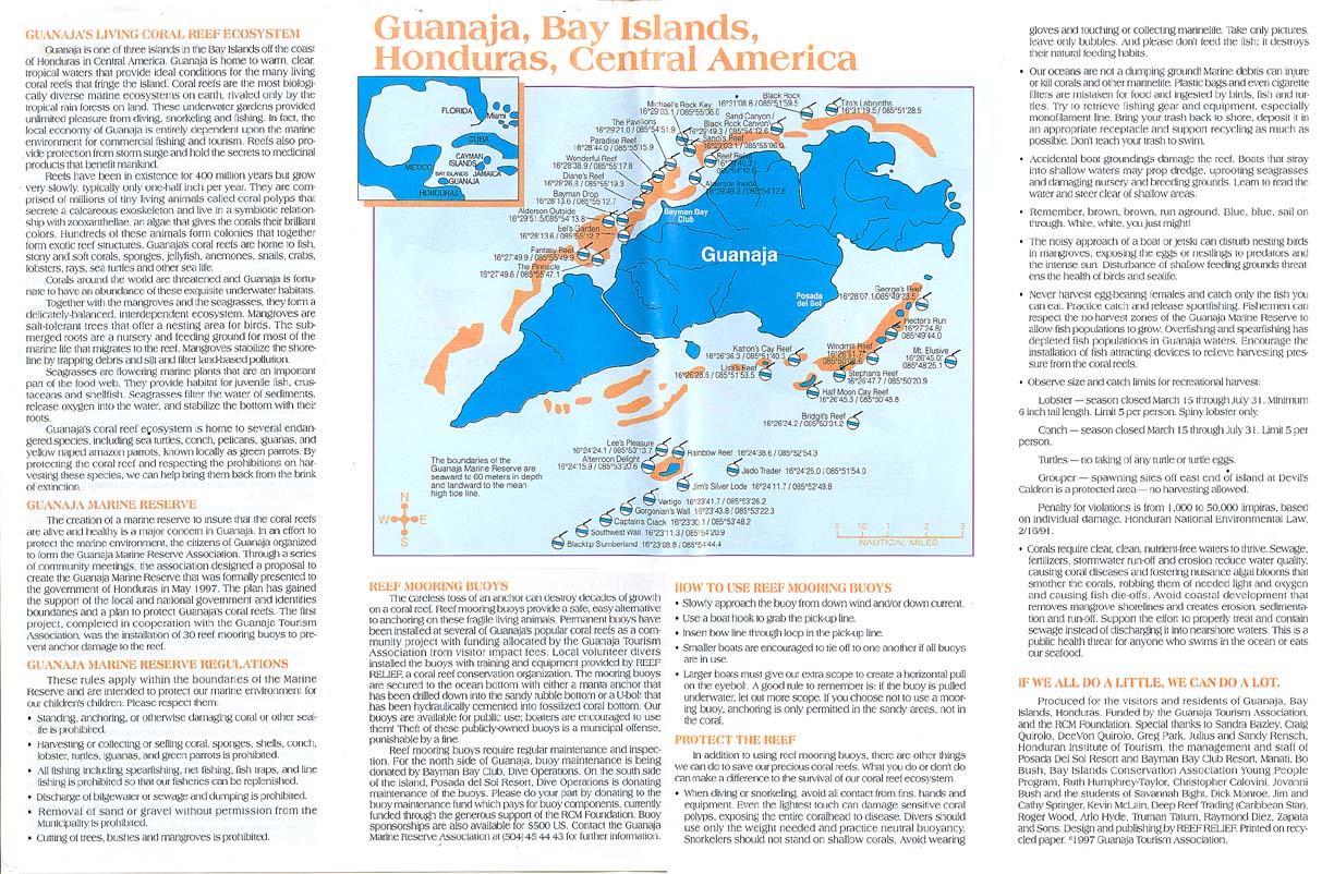 In 1997, Reef Relief's Craig and DeeVon Quirolo, in cooperation with the Guanaja Tourism Association, installed 36 reef mooring buoys to protect the fragile coral reefs surrounding the island of Guanaja, a popular dive destination off the coast of Honduras. See educational chart of buoy locations and reef tips that educate divers to the reefs.