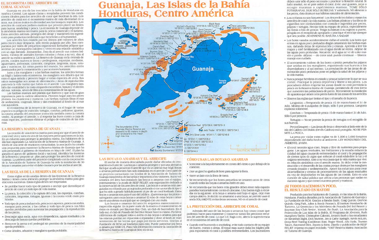 The Guanaja Tourism Association extends special thanks to the following for making this project possible: Sandra Bazley, Craig and DeeVon Quirolo of REEF RELIEF, Julian and Sandra Rensch, The Honduran Institute of Tourism, the staff and management of Posada Del Sol and Bayman Island Resorts. Deep Reef trading - Caribbean Star, roger wood, Kevin McLain, Greg Park, Jim & Cathy Springer, Bo Bush, Dick Munroe, Ruth Humphrey-Taylor and the B.I.C.A Young People's Program, Yovanny Bacca, Chris Calovini, the students from Savannah Bight, Truman Tatum, Raymond Diez Zapata and Sons. We couldn't have done it without you!